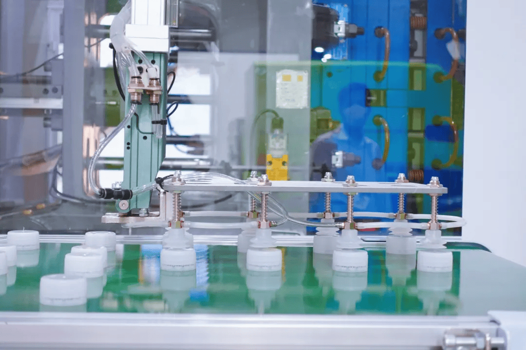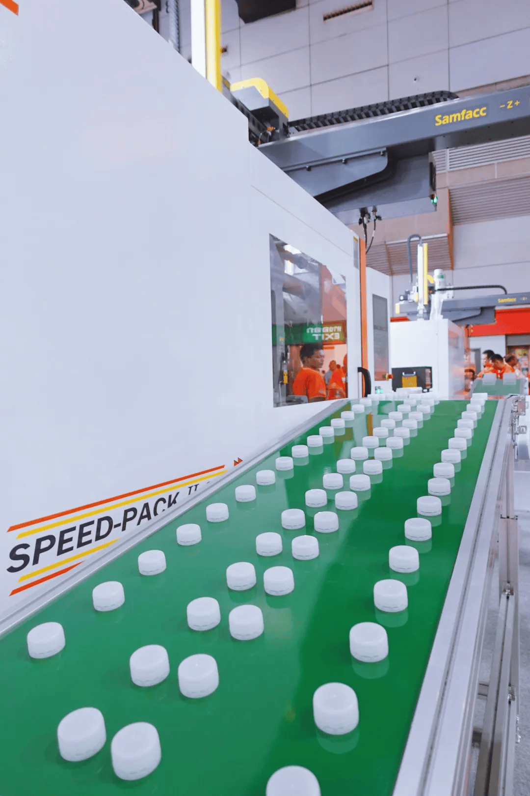 现场展示的另一台机器是高速包装机SPEED-PACK II,可为行业客户提供从模具到产品包装的整体打包方案。通过装配高塑化率的螺杆,射胶速度最大提升51%,专用高刚性机架,整体强度提高50%,更是配备了新款高响应伺服电机,动力最大提升29%。现场带来了医疗盐水盖注塑成型解决方案的生产演示。