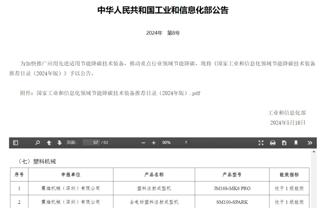 近日,中华人民共和国工业和信息化部(以下简称“国家工信部”)公示了《国家工业和信息化领域节能降碳技术装备推荐目录(2024年版)》(以下简称“《推荐目录》”)。震雄自主研发的MK6 PRO及SPARK两款设备,凭借出色的产品性能成功入选该目录,能效指标为“优于1级能效”。