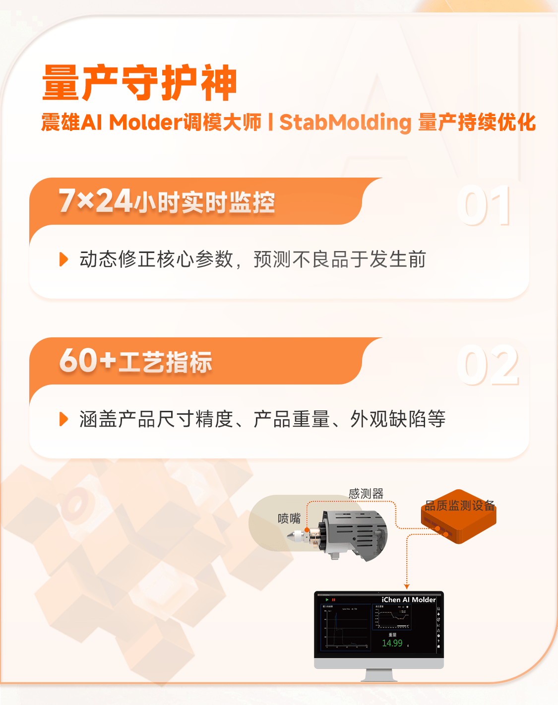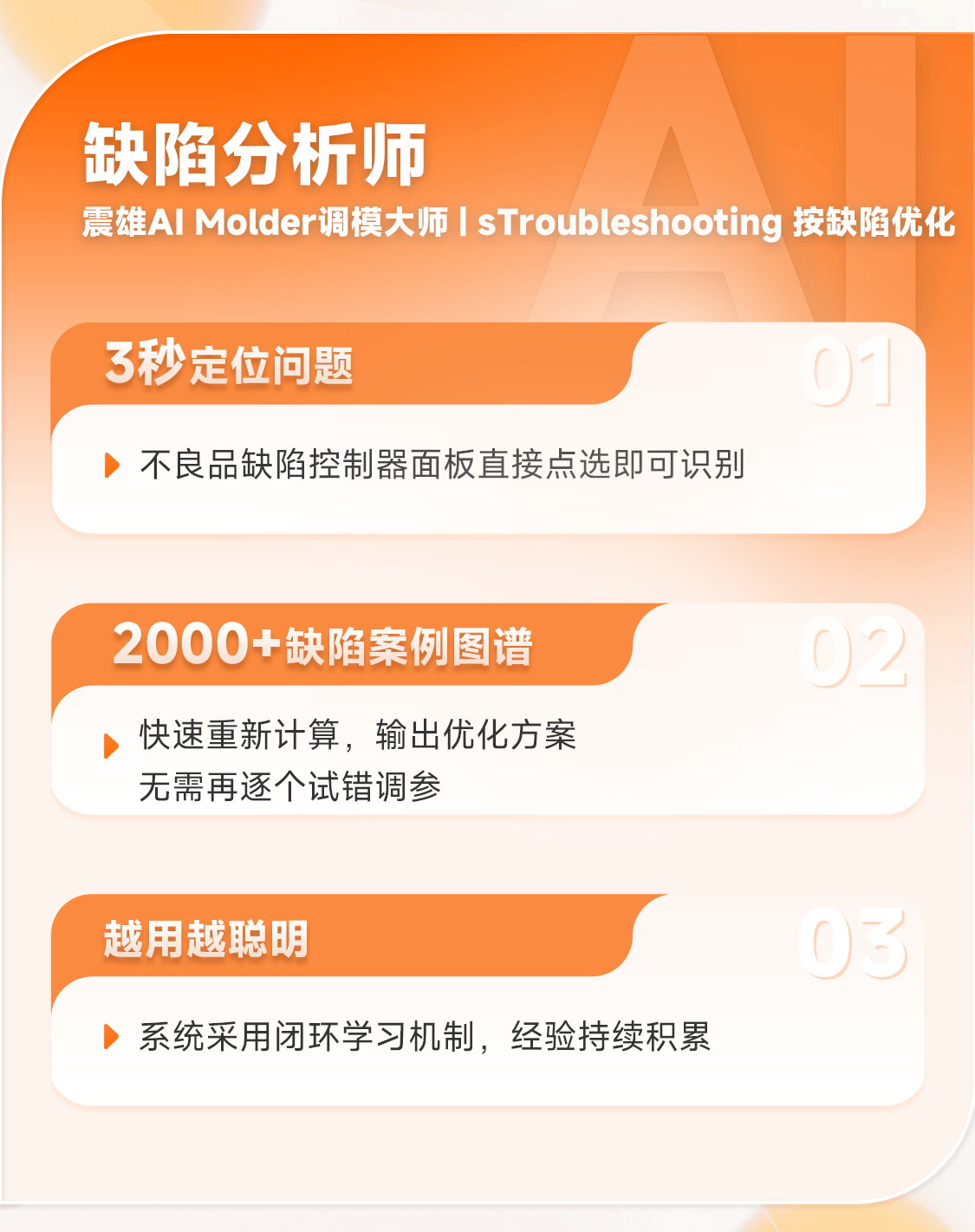 为什么选择震雄注塑机? 我们不仅提供高性能的硬件设备,更通过 iChen AI调模大师 这样的尖端软件平台,将前沿AI算法与深厚的工艺知识图谱深度融合,精准破解成型参数优化难题,有效消除各类成型缺陷,助力您实现良率显著提升、能耗大幅优化、设备利用率持续增长。