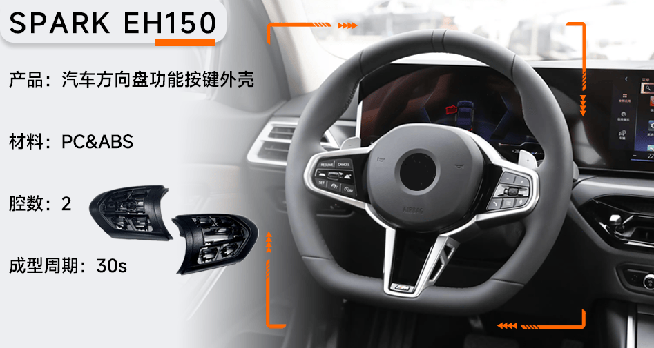 随着人们对智驾出行的多需求,高刚性、轻量化、人机交互优化控制组件成为现代人享受智驾出行的关键因素。此次SPARK EH150带来汽车方向盘解决方案,其汽车方向盘功能按键外壳在现场凭借SPARK EH150高效、节能的生产,全方位满足产品结构强度及安装尺寸精度要求。