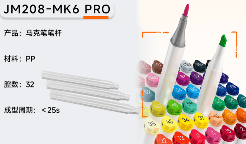 对文具行业需要低成本+高质量的双向特点,JM 208-MK6 PRO:高效稳定、智能节能等优势,轻松破解文具行业"低成本+高质量"难题,现场实现马克笔笔杆多腔、高良率,不失为文具行业首选。