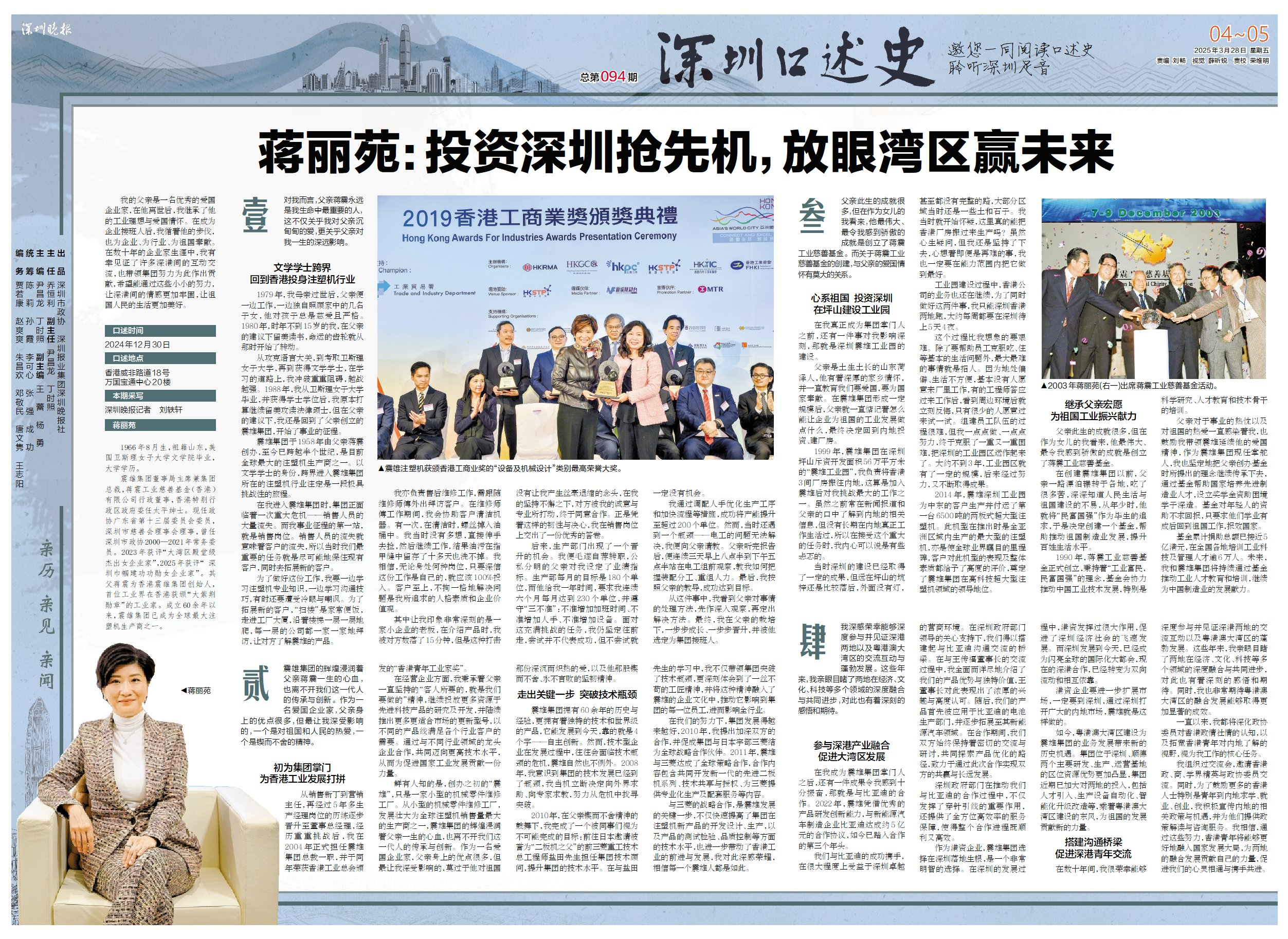 近日,震雄集团主席兼总裁蒋丽婉女士应深圳晚报《深圳口述史》栏目邀请,分享了她在塑机行业的创业历程、家族企业传承经验,以及对深港合作前景的深刻见解。