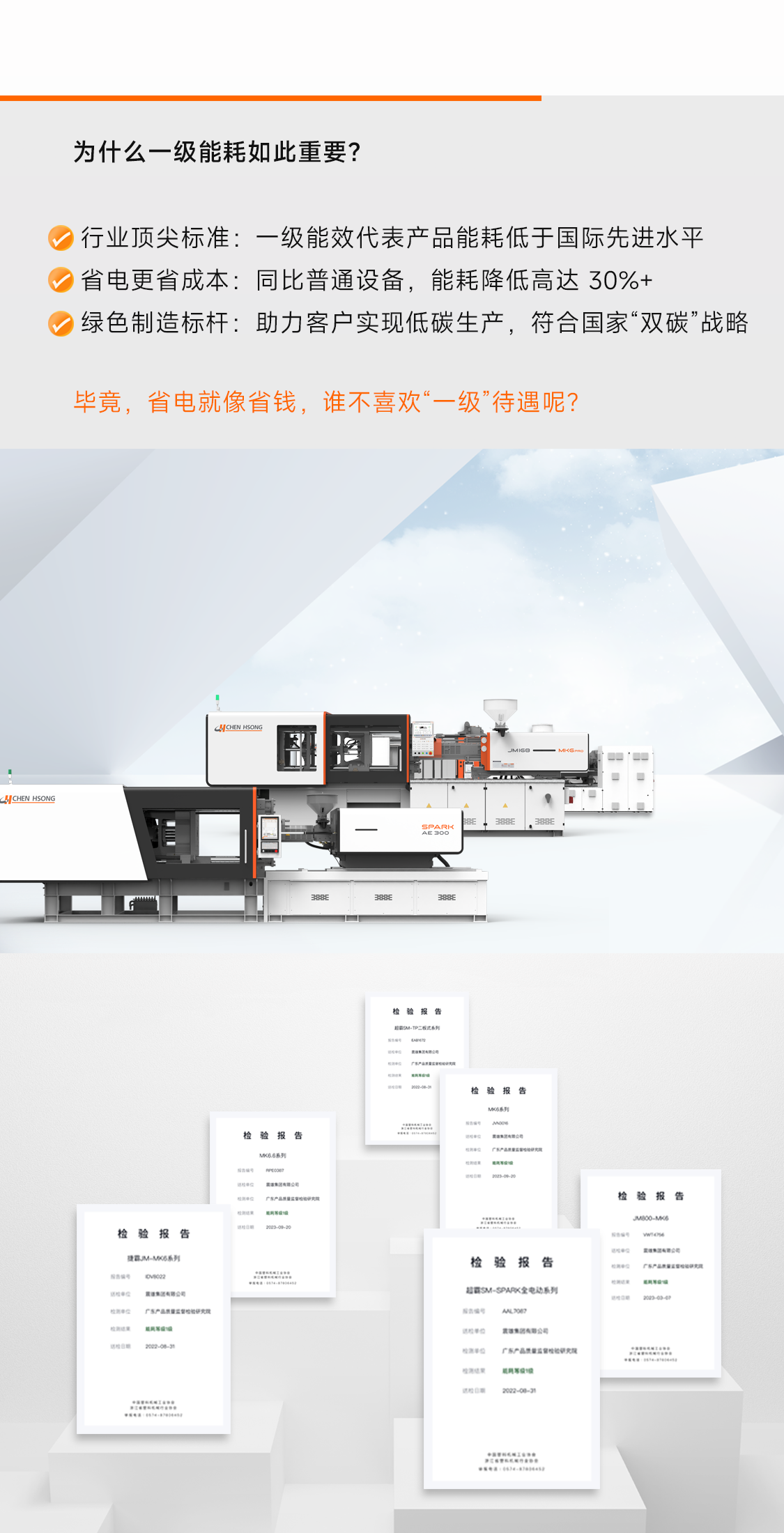 震雄SPARK 全电动系列、SM-TP二板机系列、JM-MK6系列、MK6/MK6.6等机器已通过GB/T30200-2013国家级测试,耗能低到对手怀疑人生。