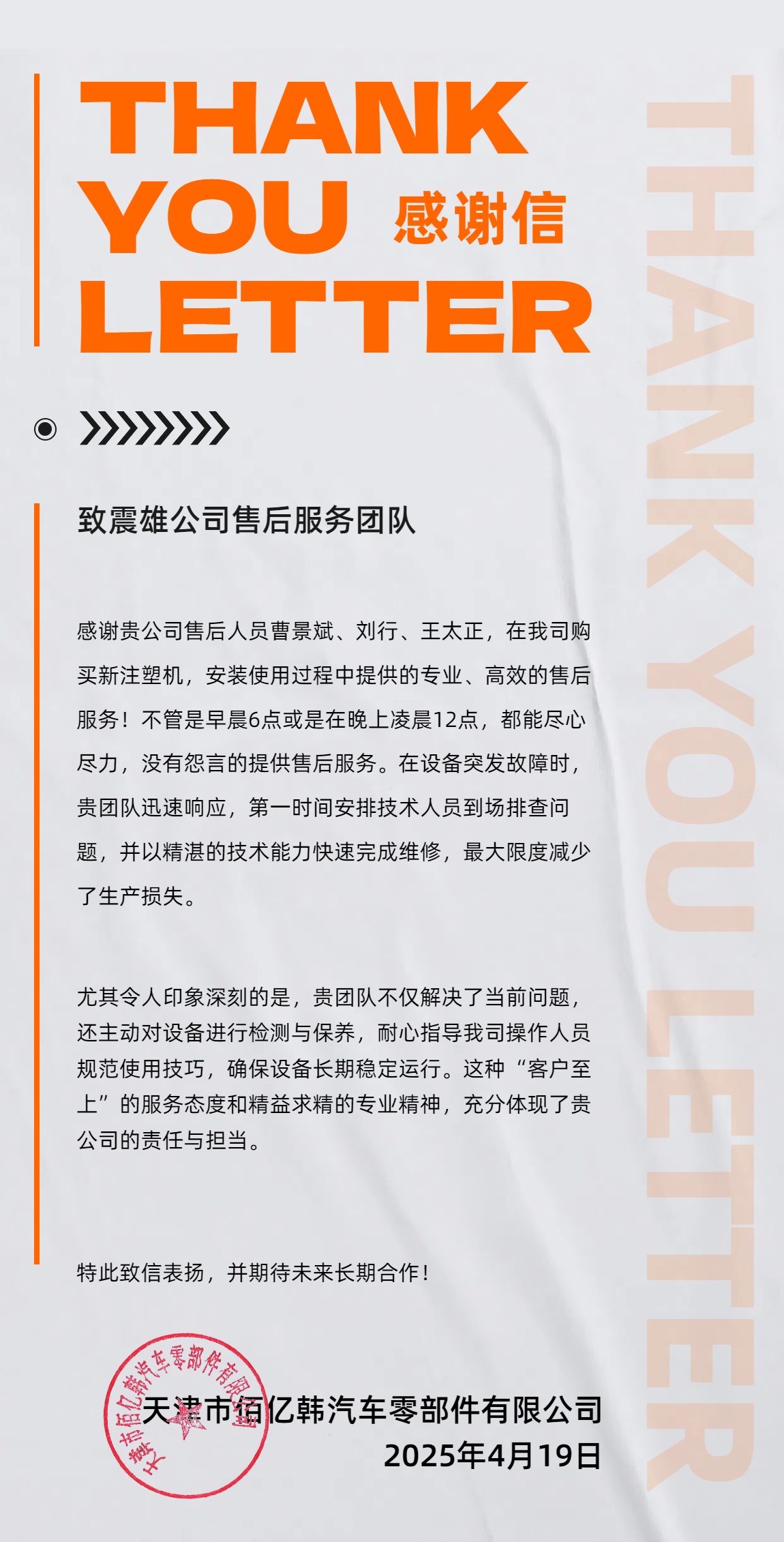 近日,震雄收到了一封来自佰亿韩的感谢信。信中特别提到震雄集团售后服务团队的曹景斌、刘行、王太正三位售后工程师——在客户设备突发故障的紧急时刻,他们24小时待命响应,以“零延迟”的效率和“零抱怨”的态度,快速化解客户生产危机,更主动为客户设备“把脉体检”,从根源降低故障风险。