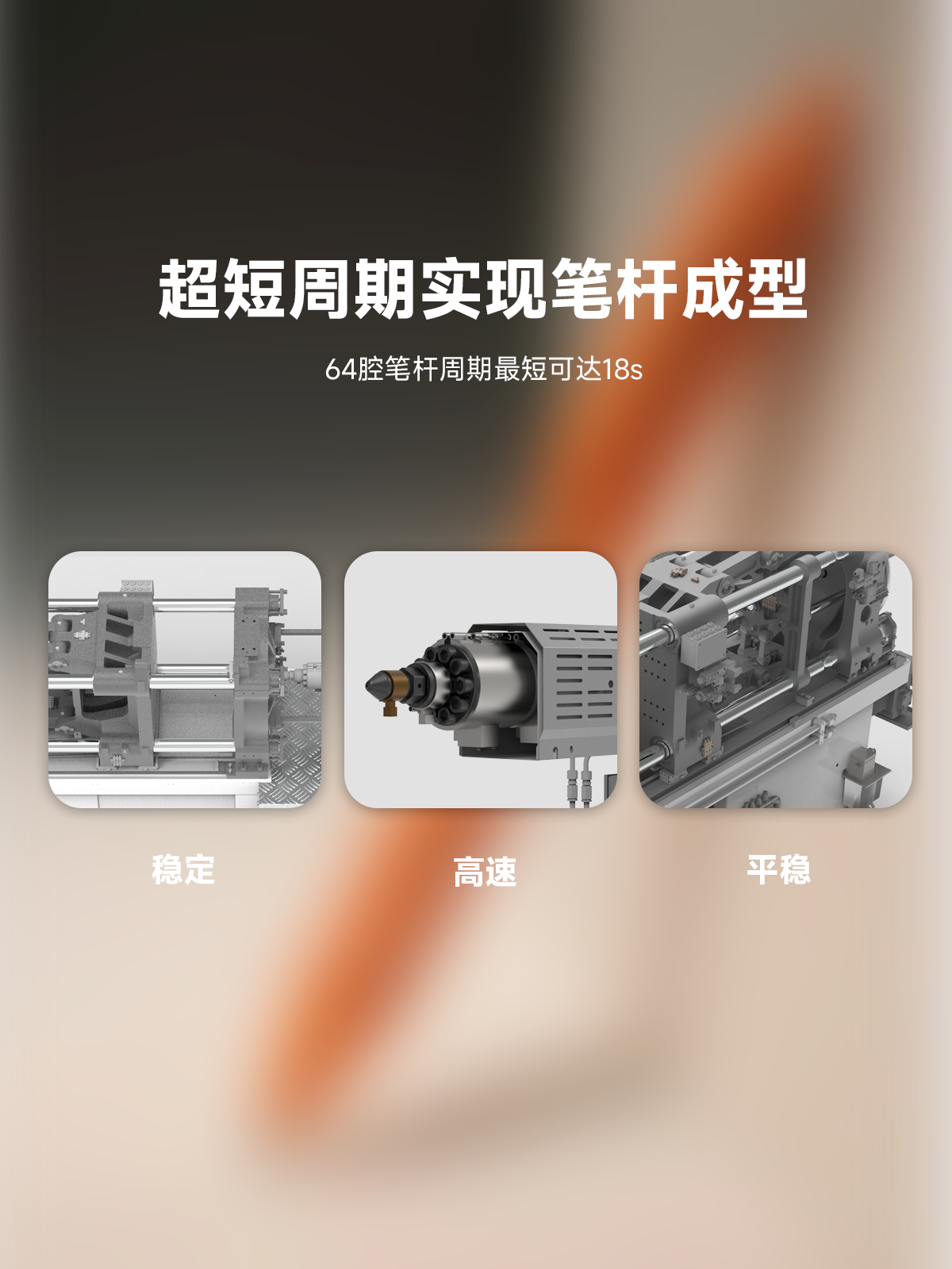 这款划时代的设备以64腔高效模具系统为核心,将笔杆成型周期压缩至惊人的18秒极限,犹如一支精准的瑞士钟表,以分秒必争的效率重塑行业标准。