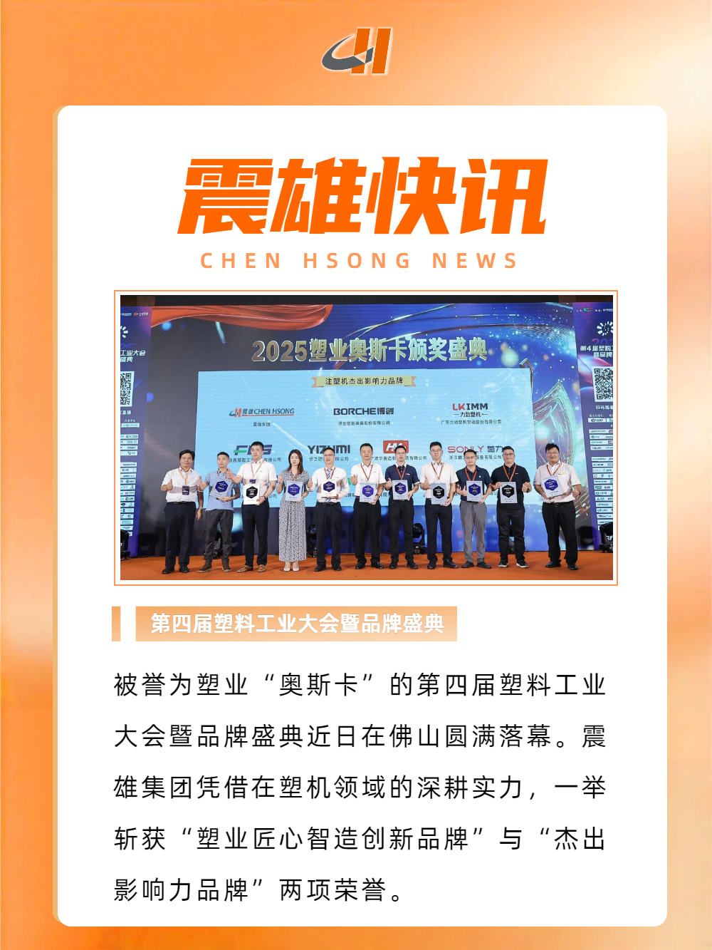 在近日佛山落幕的第四届塑料工业大会暨品牌盛典上,以 “客户需要的就是我们要做的” 为核心的震雄集团,凭借定制化注塑机解决方案与优质服务,斩获 “塑业匠心智造创新品牌”“杰出影响力品牌” 两项荣誉,其 “以用户需求驱动产品创新” 的理念获行业高度认可。
