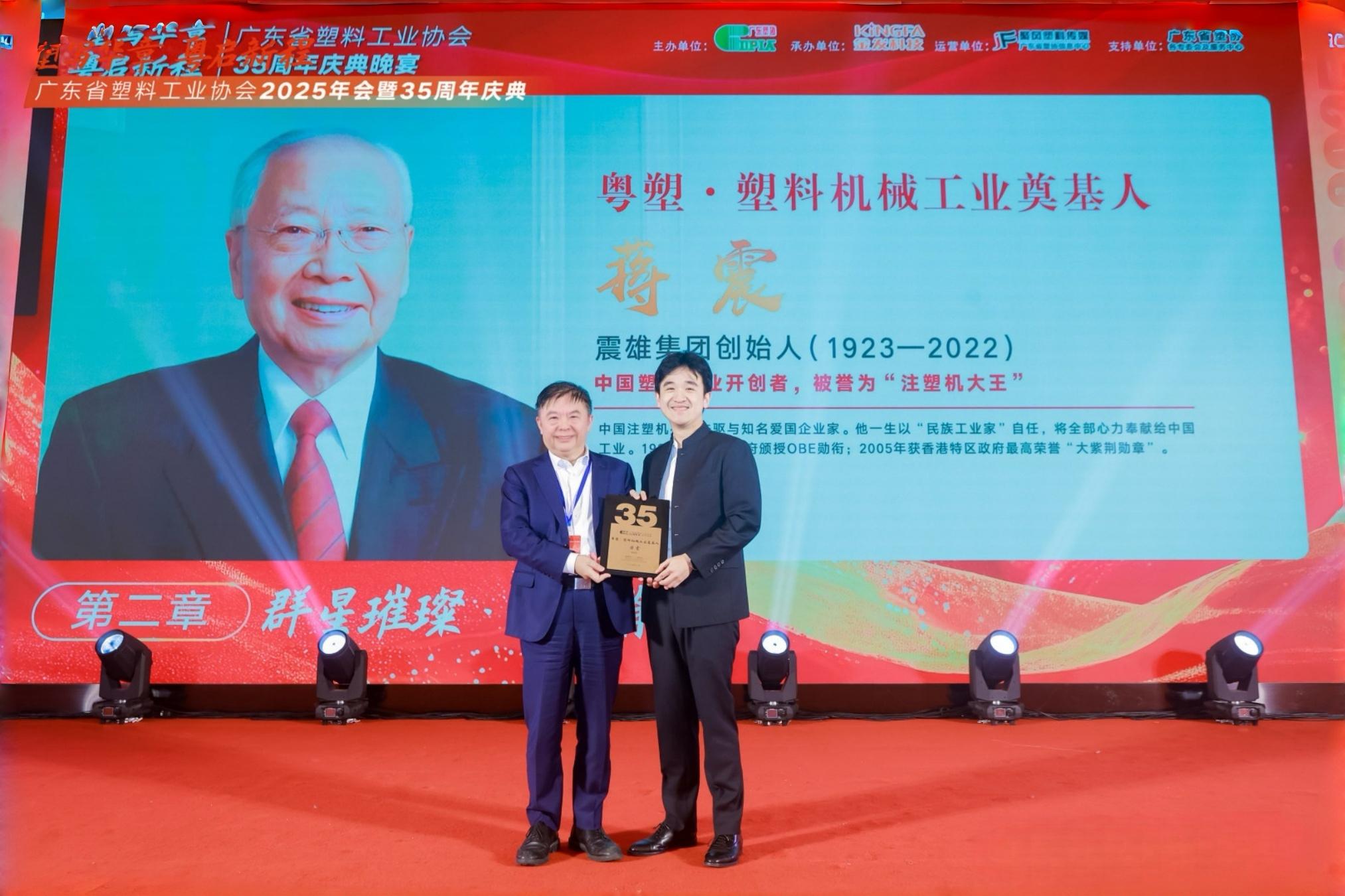 大会特别设立了“粤塑·塑料机械工业奠基人”荣誉奖项,以深切缅怀并致敬行业开拓者。震雄集团创始人蒋震博士被追授此项殊荣,以表彰其为中国塑料机械工业发展所做出的不可磨灭的奠基性贡献。其事迹将被永久载入协会35周年精装纪念册,蒋震博士的创业精神与行业远见,将持续激励后来者前行。