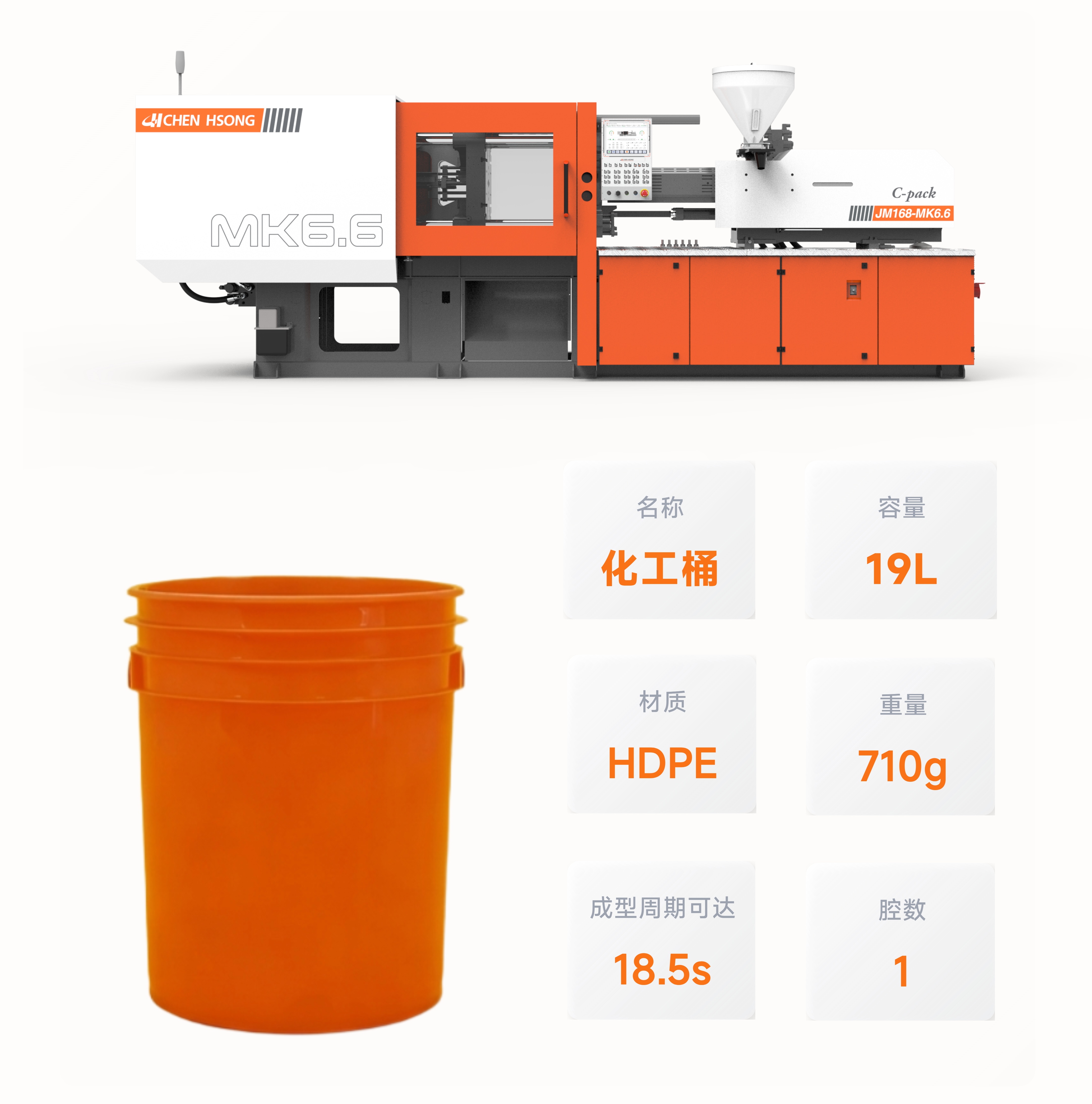 震雄MK6.6/C-PACK注塑机专为生产耐酸碱、抗氧化等高性能化工桶而生。其搭载特设的专用塑化螺杆与高速耐磨液压马达,配合双缸射移装置与高精度伺服控制系统,确保射胶过程的精准稳定的同时,让生产过程更加高效节能。