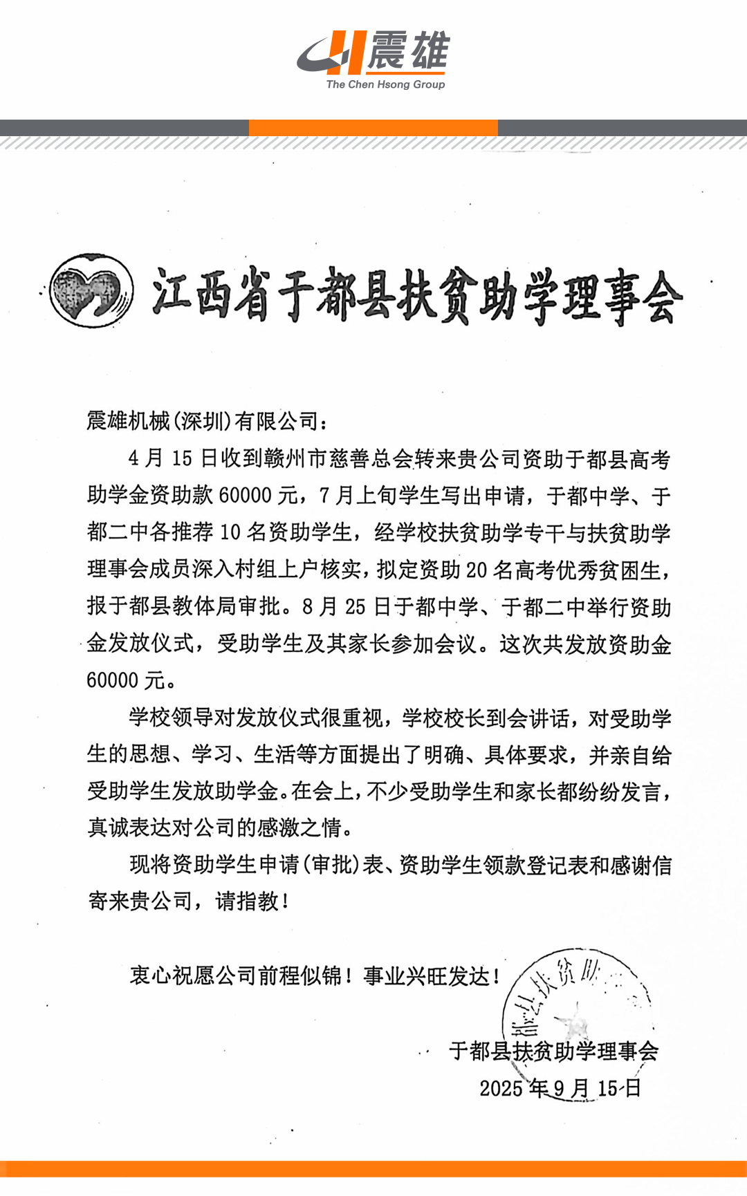 此次于都助学项目,正是震雄公益精神的延续与践行。