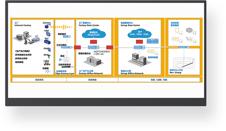 设备联网采用先进的技术,支持的物联网协议有:MQTT、MODBUS、OCP-UA等,通过有线、无线、4G、5G的网络,将车间的自动化生产设备实现网络连接,自动进行实时、准确、客观的数据采集,并进行异常处理。物联网是实现数字化转型的重要“抓手”。